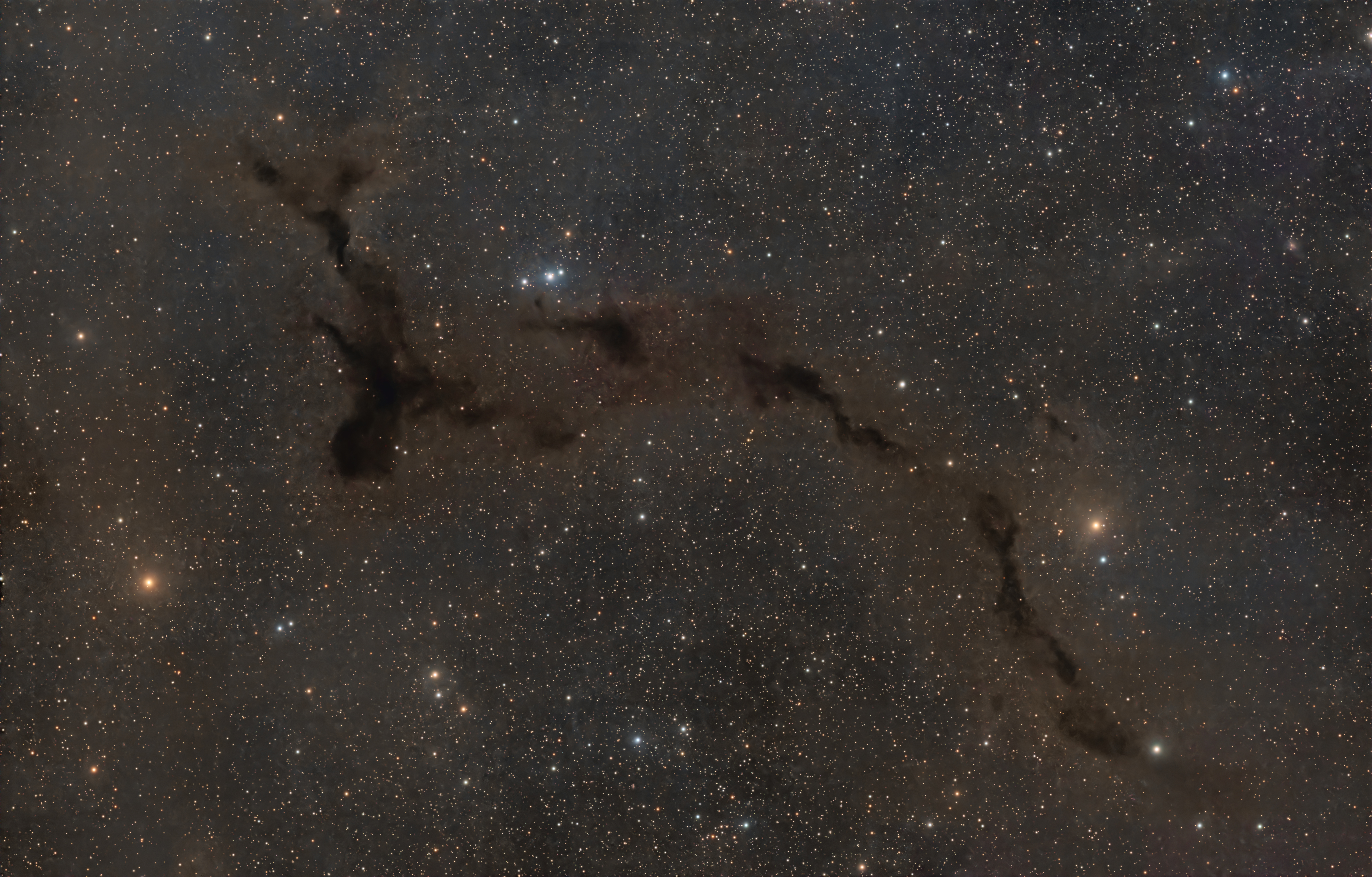 Barnard 150 (B150) is a dark nebula in the constellation Cepheus. It is about one degree long (about two Moon widths). It’s sometimes referred to as the Seahorse nebula. It is made up of soot and dust within our galaxy. It appears dark because it is blocking out the light of stars behind it. The rich star field in which this object is set displays stars of many hues, which depend on their temperatures (blue and white are hotter; yellow and reddish are cooler).