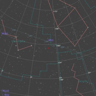 Cassiopeia A (Cas A) is a supernova remnant in the northern constellation of Cassiopeia. It seems to be rarely imaged by amateurs. It is about 11,000 light years from us, and 10 light years across. The teal hues in the image come mainly from oxygen emissions. The red in Cas A is mostly from sulfur emissions. The red elsewhere in the image is mostly due to hydrogen emissions. The light from this supernova is thought to have reached Earth in the late 1600s, but there are no records of its observation at that time. Although Cas A a very faint object at visual wavelengths shown in this image, it’s the brightest radio source in the sky, other than the Sun. It spans about 5 arcminutes on the sky, about 1/6 the diameter of the Moon. There’s a massive neutron star at the centre of the remnant.