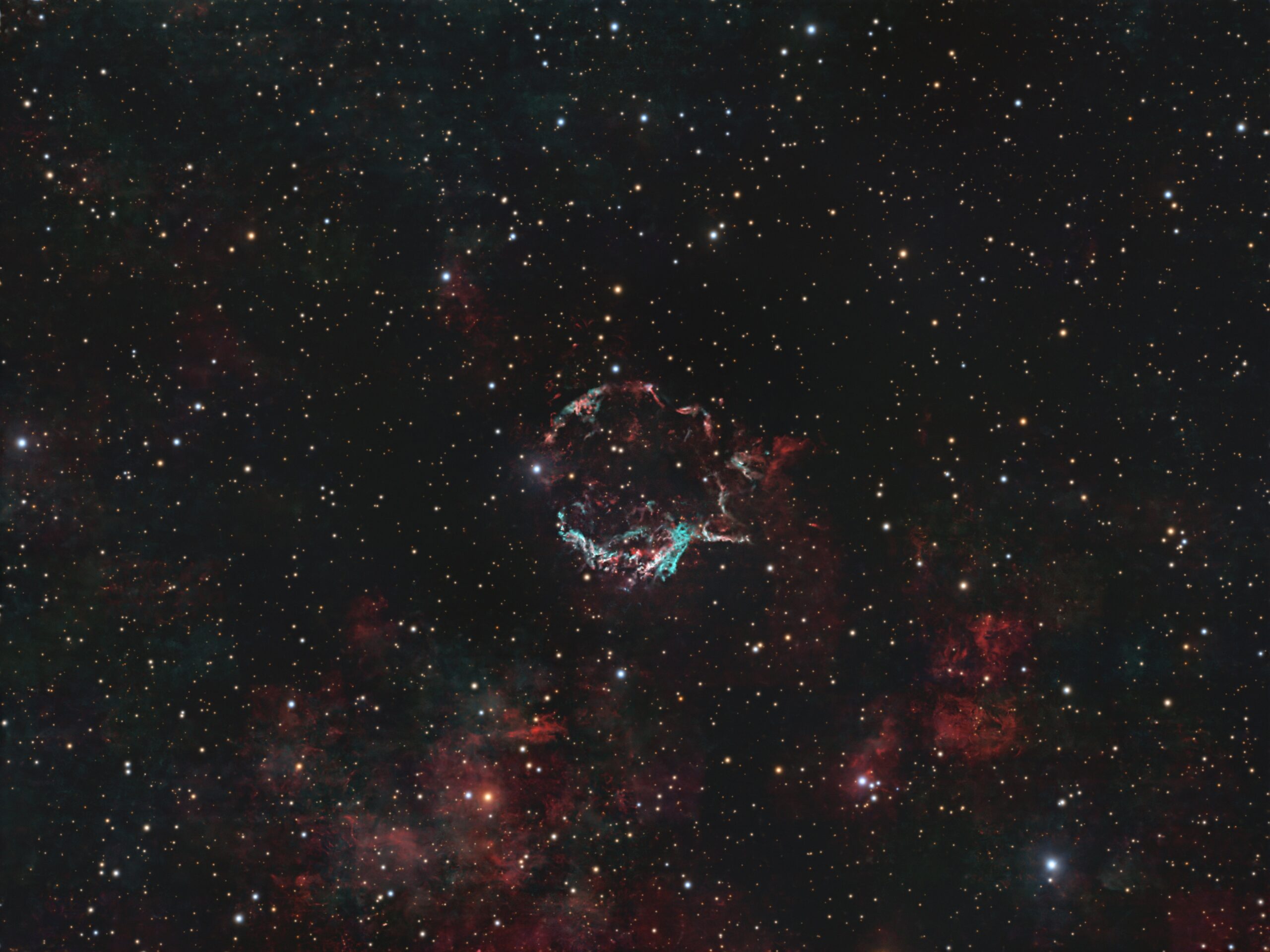 Cassiopeia A (Cas A) is a supernova remnant in the northern constellation of Cassiopeia. It seems to be rarely imaged by amateurs. It is about 11,000 light years from us, and 10 light years across. The teal hues in the image come mainly from oxygen emissions. The red in Cas A is mostly from sulfur emissions. The red elsewhere in the image is mostly due to hydrogen emissions. The light from this supernova is thought to have reached Earth in the late 1600s, but there are no records of its observation at that time. Although Cas A a very faint object at visual wavelengths shown in this image, it’s the brightest radio source in the sky, other than the Sun. It spans about 5 arcminutes on the sky, about 1/6 the diameter of the Moon. There’s a massive neutron star at the centre of the remnant.