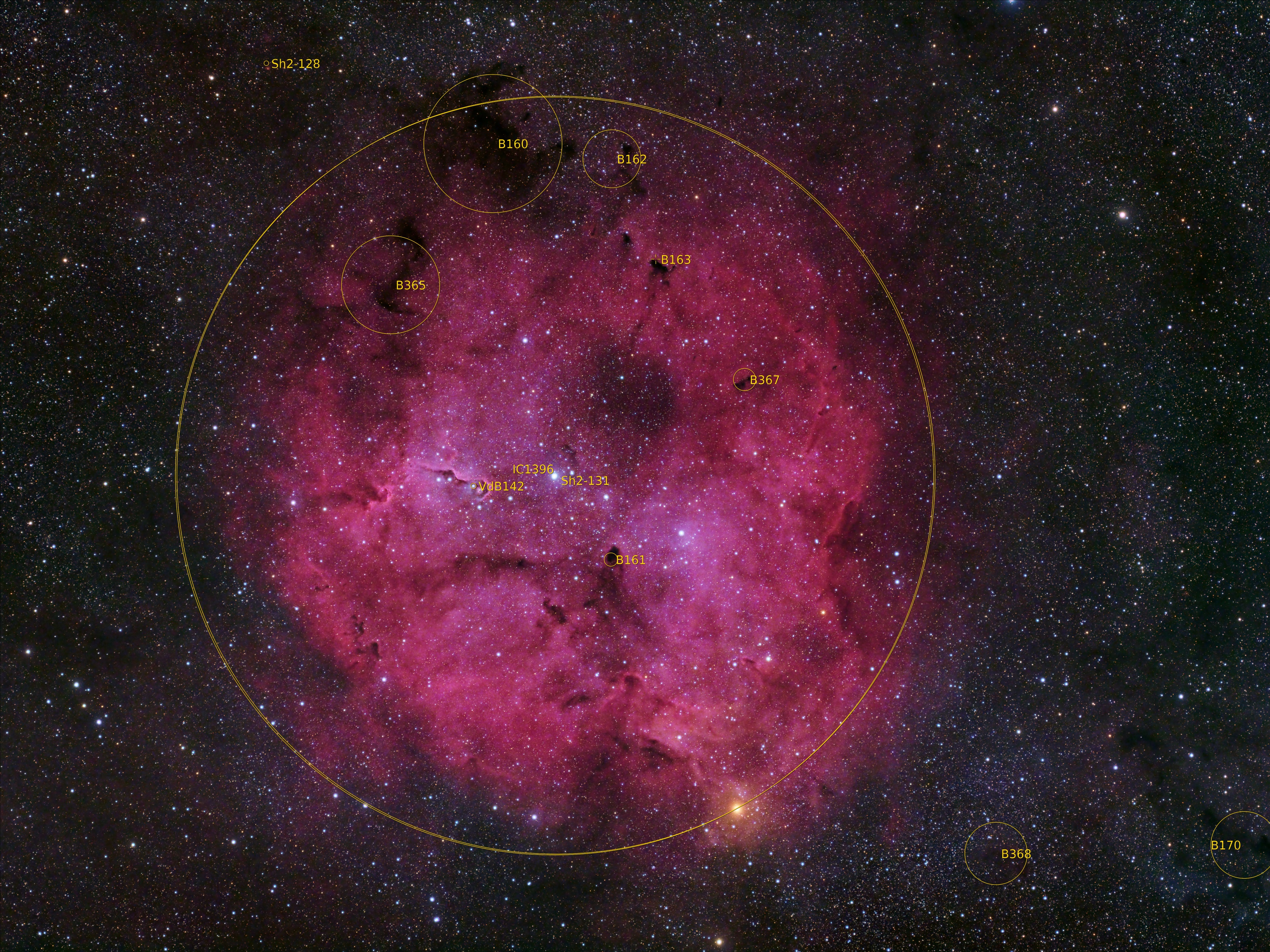 IC 1396 is a large cloud of faintly glowing gas, composed mainly of hydrogen. It is a huge object in the sky, with a diameter more than six times that of the Moon. That’s because it is both relatively close to us (2,400 light years) and big (more than 100 light years across). The energy that makes IC 1396 glow comes from the bright star near the centre of the nebula, called HD 206267. Jutting in from the 9 o’clock position is the Elephant’s Trunk Nebula, which features in another image I’ve taken of this object. The Elephant’s Trunk is a star forming region, and there are a number of very young stars — less than 100,000 years old — in its vicinity. IC 1396 is textured throughout with many dark nebula. It’s hard not to notice mu-Cephei, the brightest star in the image, near bottom centre. It is about 38,000 times as bright as the Sun. Bring your sunscreen.
