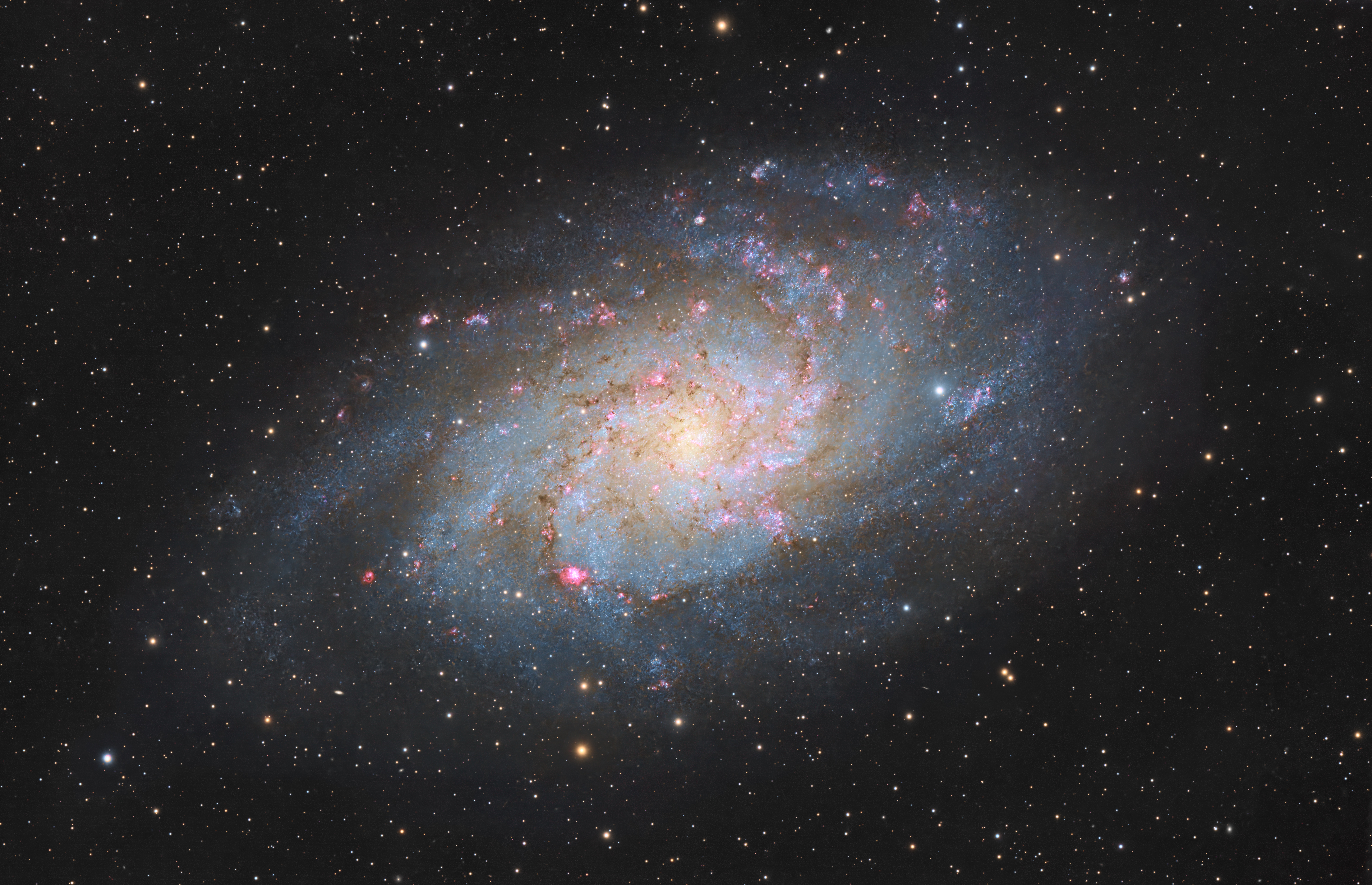 Because of its size and relative closeness to us, M33 displays a wealth of detail in photographs, including a variety of colours in different structures:  blue star clusters, pink emission nebulae (similar to our Milky Way’s Orion Nebula), brown dust lanes and a yellowish core. Numerous other galaxies are also in the image, but can easily go unnoticed due to the overwhelming richness of M33.