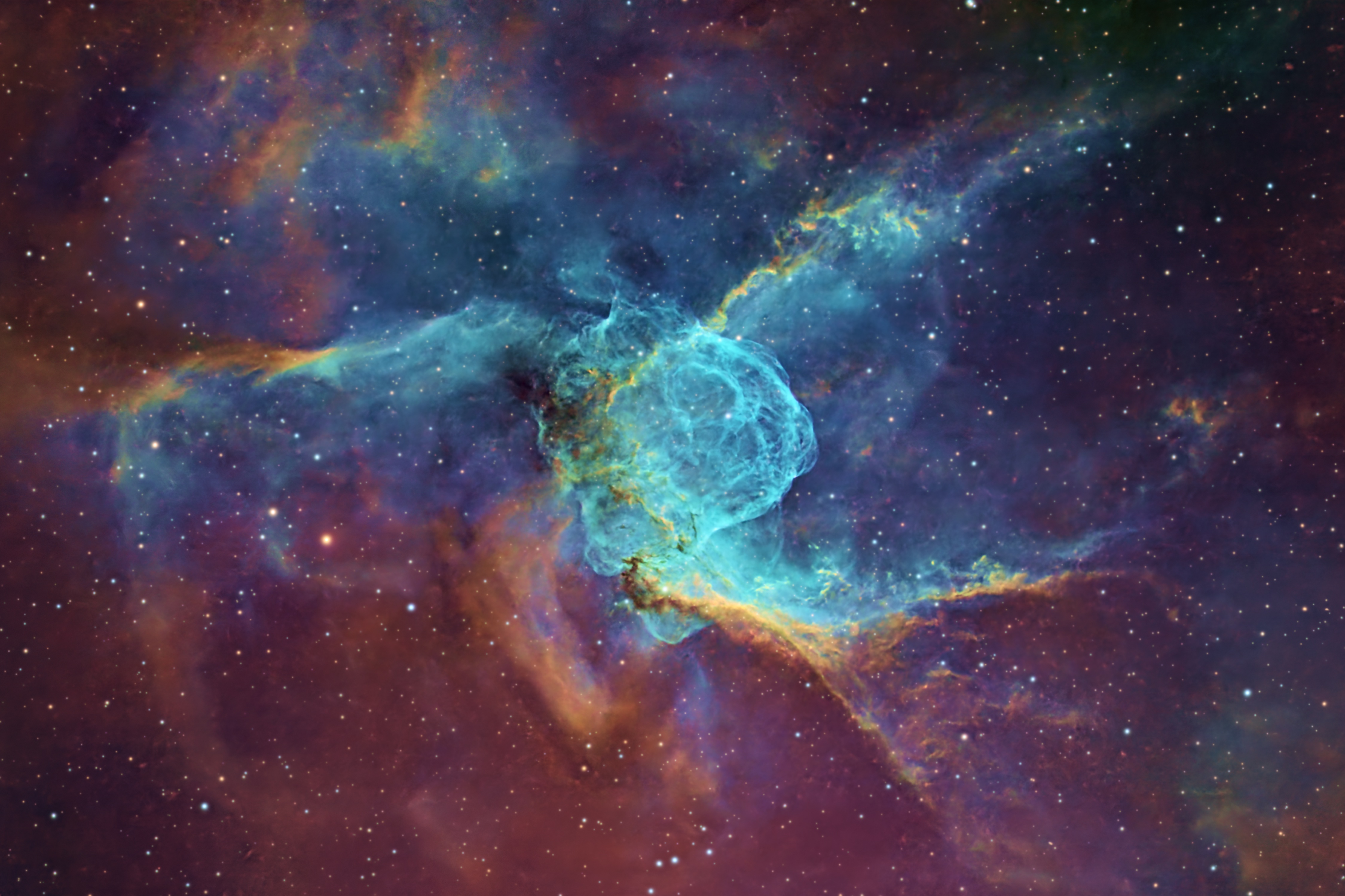Stretching: MaskedStretch was applied to the HaO3RGB image to make a pleasing, bright image, followed by a contrast boost with CurvesTransformation.