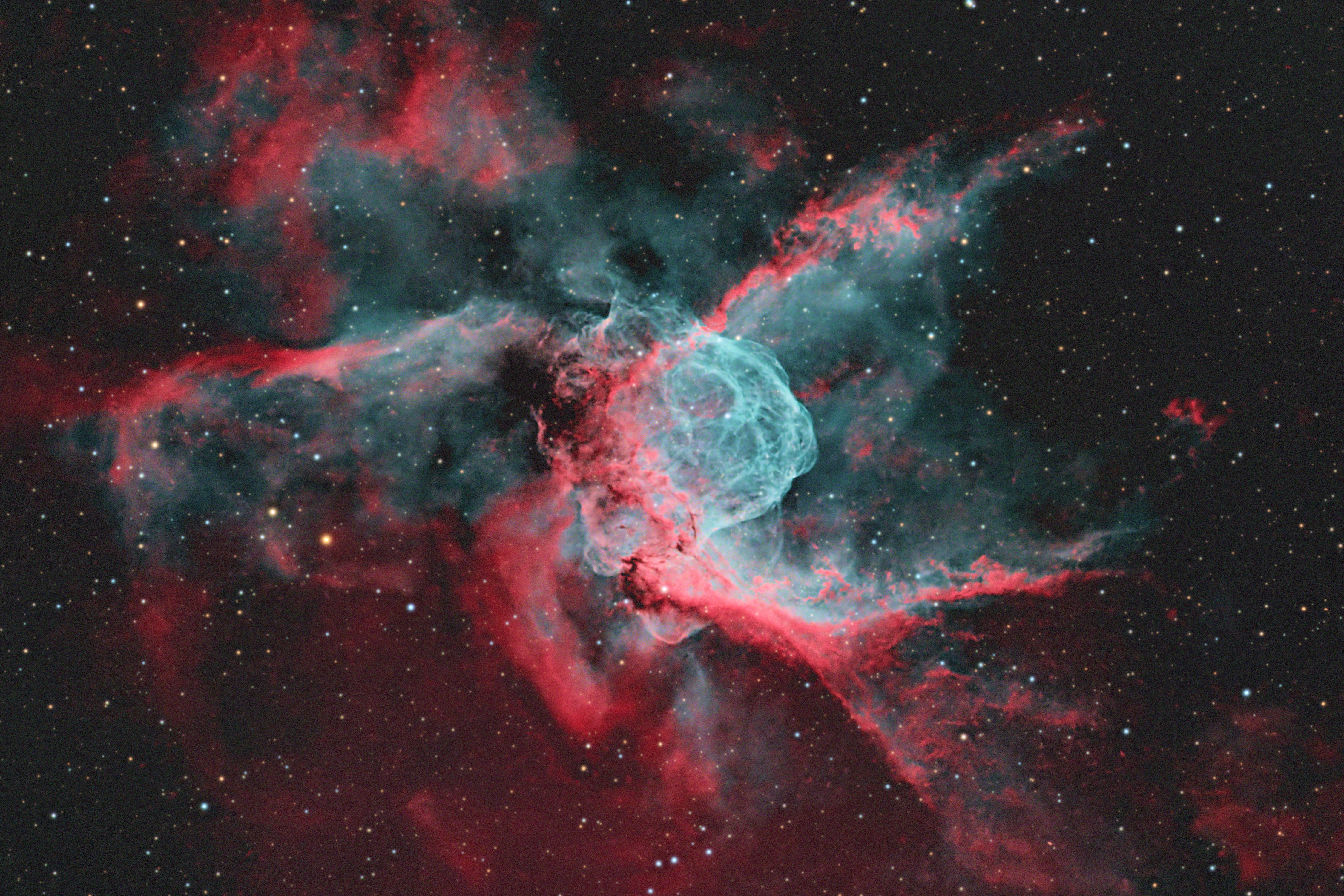Contrast Enhancement: LocalHistogramEqualization was applied twice, using a mask to select only the brighter parts of the nebula, protecting stars and background. The first pass used a scale of 50 and strength of 0.9; the second used a scale of 150 and strength 0.5.