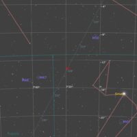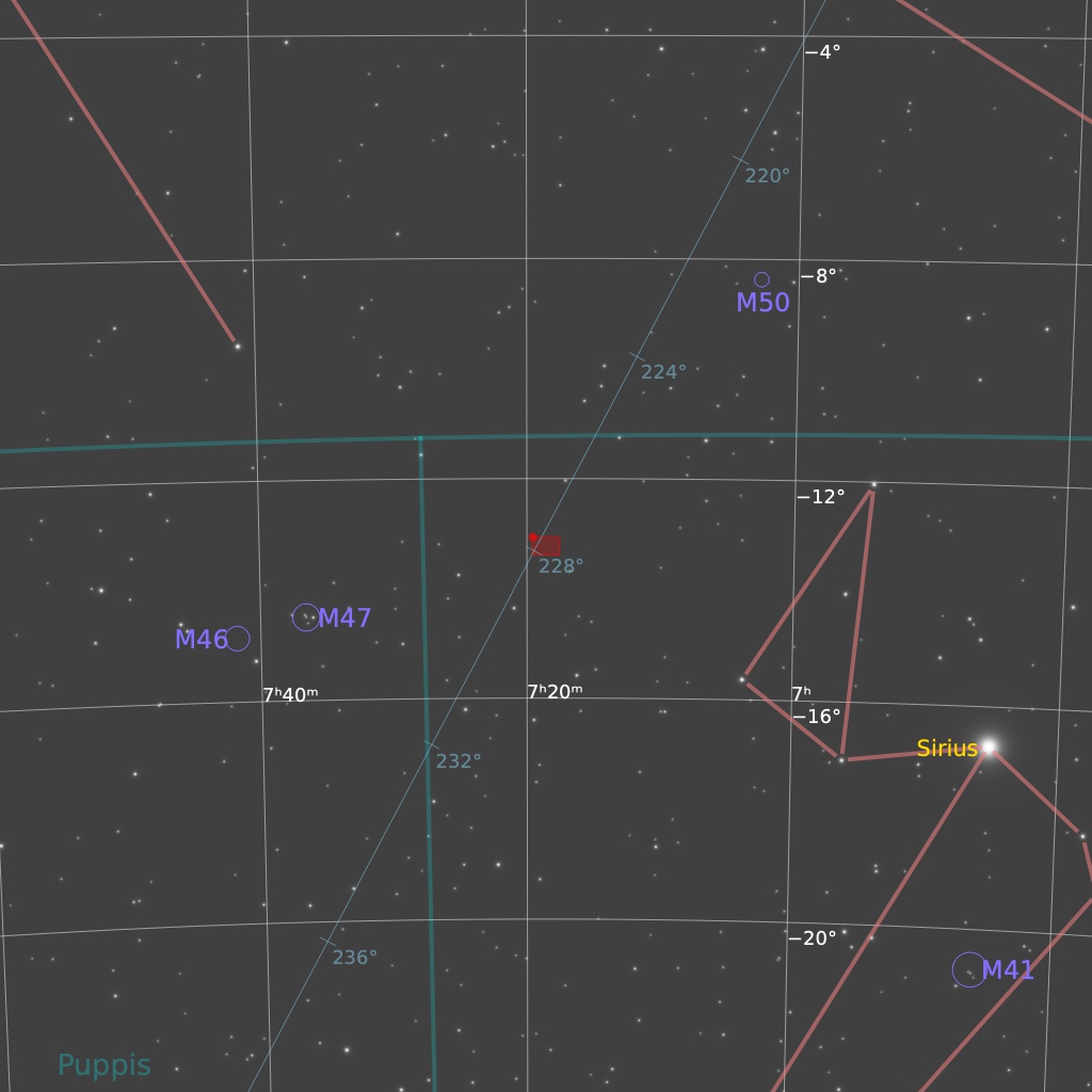 Thor’s Helmet (NGC 2539, Sh2-298, Gum 4) is an emission nebula in Canis Major. The powerful Wolf-Rayet star WR7 near the centre of the nebula is causing the gases to glow. That star is thought to be in a brief pre-supernova stage, and could explode in the cosmically-not-too-distant future. This object is thought to be similar to the Bubble Nebula, but the energy from WR7 has blown the gas in Thor’s Helmet into more complex shapes. Thor’s Helmet also contains much more oxygen structures than the Bubble Nebula. Oxygen gives the teal-coloured structure; hydrogen provides the reds. This nebula contains hundreds of solar masses of ionized gases (the gases that are glowing), along with hundreds of thousands of solar masses of unionized material. The age of the nebula is uncertain, with estimates ranging from 78,500 to 236,000.