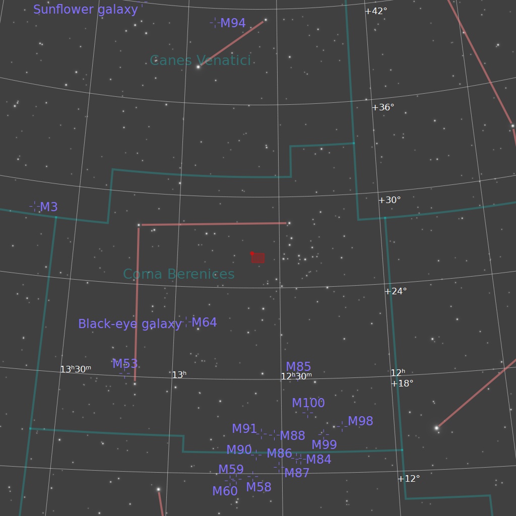 Final Steps: Background, galaxy and star brightness, contrast and saturation were adjusted in several iterations using CurvesTransformation with masks as required. ICCProfileTransformation (sRGB IEC61966-2.1; Relative Colorimetric with black point compensation) was applied prior to saving as a jpg. The image was annotated with the AnnotateImage script. The finder chart was made using the FindingChart process.