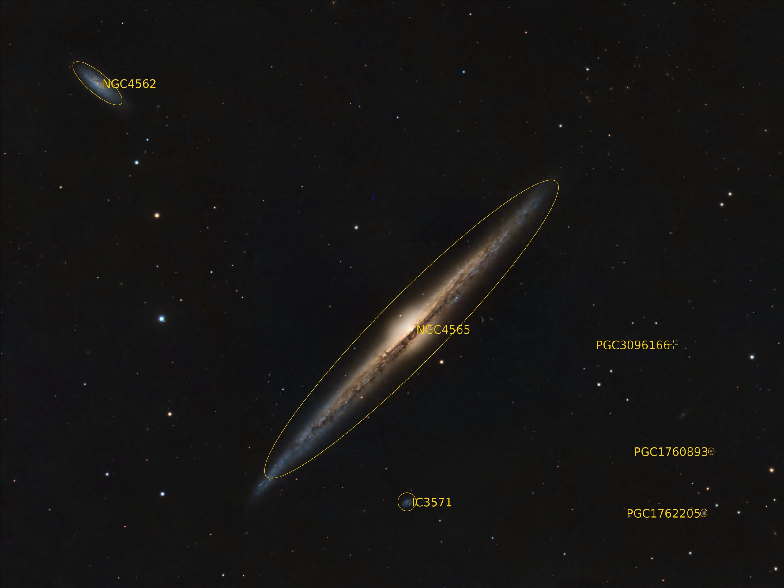 NGC 4565, The Needle Galaxy, lies about 30-50 million light years from Earth in the constellation Coma Berenices. It has a diameter of about 100,000 light years, similar to that of our own Milky Way galaxy. Its length appears about half the Moon’s width in images, and somewhat less through the eyepiece. Although it is classified as a barred spiral galaxy, the central bar isn’t visible in this image, because the galaxy is edge-on to our line of sight. However, the bar’s presence is evident from Spitzer Space Telescope data. Several other galaxies also appear in this field. The most prominent, and showing some nice detail, is NGC 4562 at upper left. There are also many unmarked galaxies, including many off the upper right tip of NGC 4565. The annotated image shows the location of a few of these galaxies. I’ve imaged this many times before, but no previous image shows such good resolution. I’m really enjoying the C14.