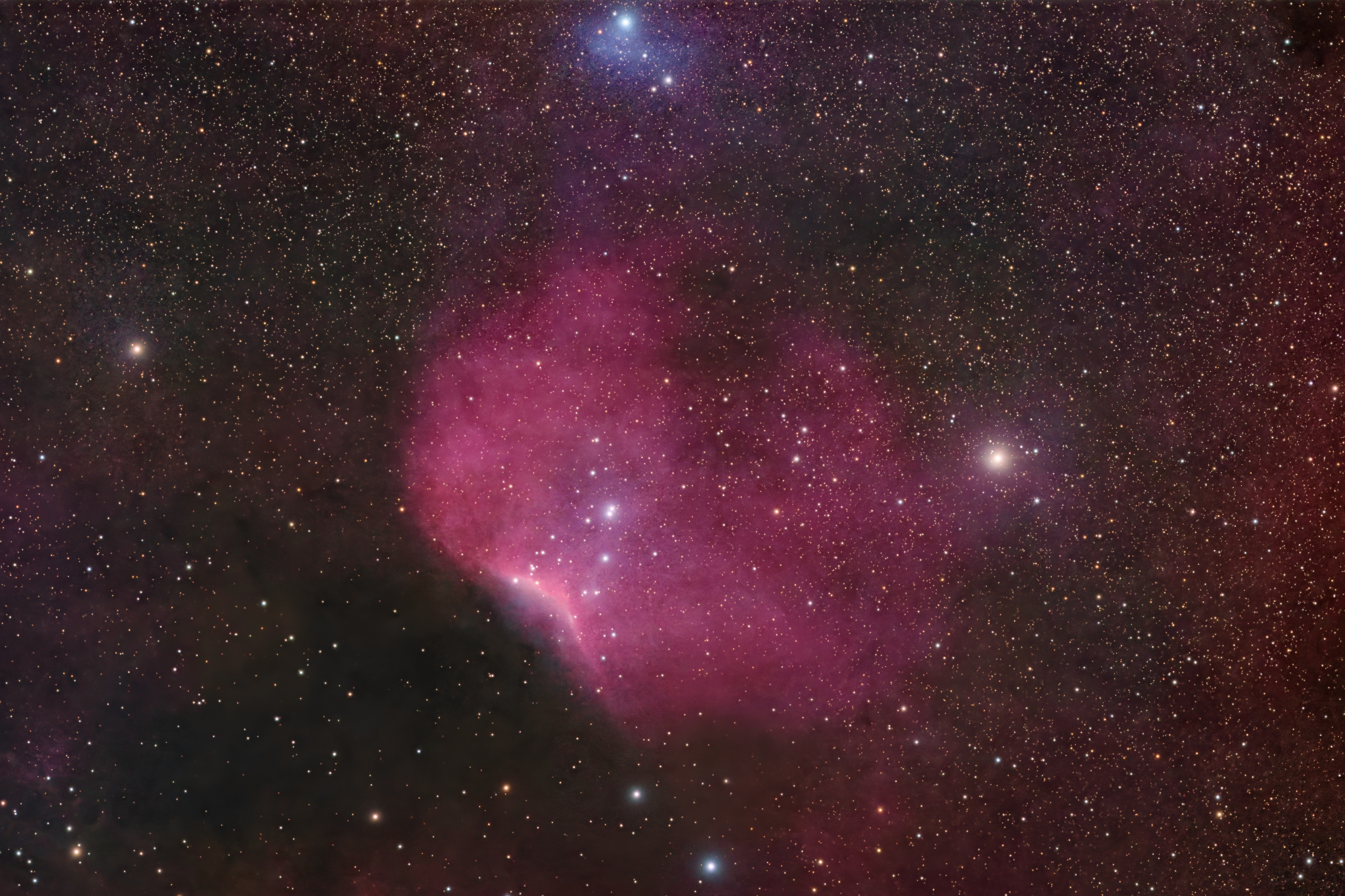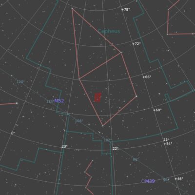 This emission nebula lies about 3000 light years from Earth. The glowing gas is mostly hydrogen, which emits mainly red and some blue light. The brightest areas also contain oxygen, which emits at green and blue wavelengths. It is part of the Cepheus Bubble, and is considered to be a stellar nursary. Near the top centre of the image is reflection nebula GN 22.12.3. I couldn’t find any information about it other than its catalogue number (with the Seti Astro What’s In My Image script).