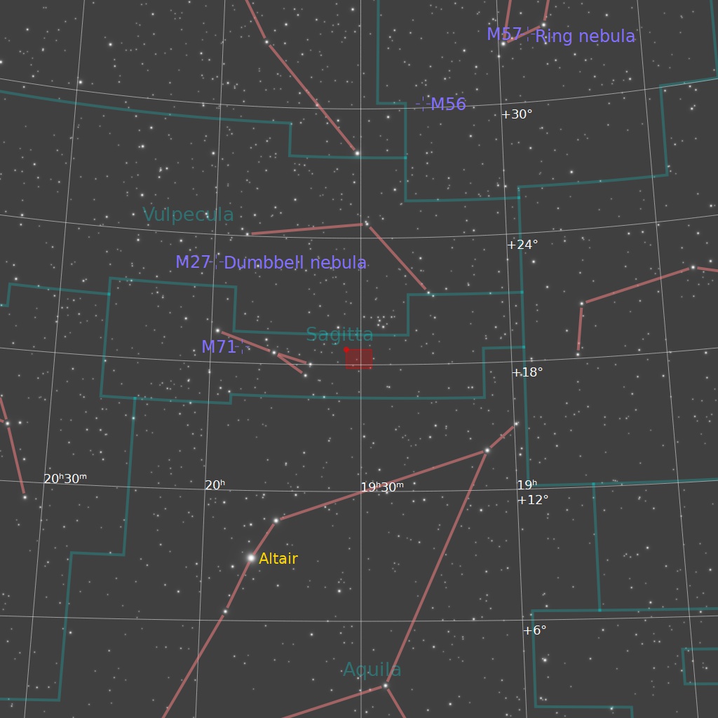 This image shows Sh2-82, also catalogued as LBN 29 and sometimes referred to as the Little Cocoon Nebula, in reference to the much more famous Cocoon Nebula. It lies in Sagitta, the Arrow, in a rich part of the Milky Way around 4,000 light years distant. The nebula is an active star-forming region made of two parts: a red emission nebula surrounded by a “halo” of bluish reflection nebula. The emission nebula is glowing red due to hydrogen in this star-forming region. The reflection nebula is shining by reflected starlight, like a mirror. There are many dark pockets of dust and soot throughout the image, blocking out starlight behind it.